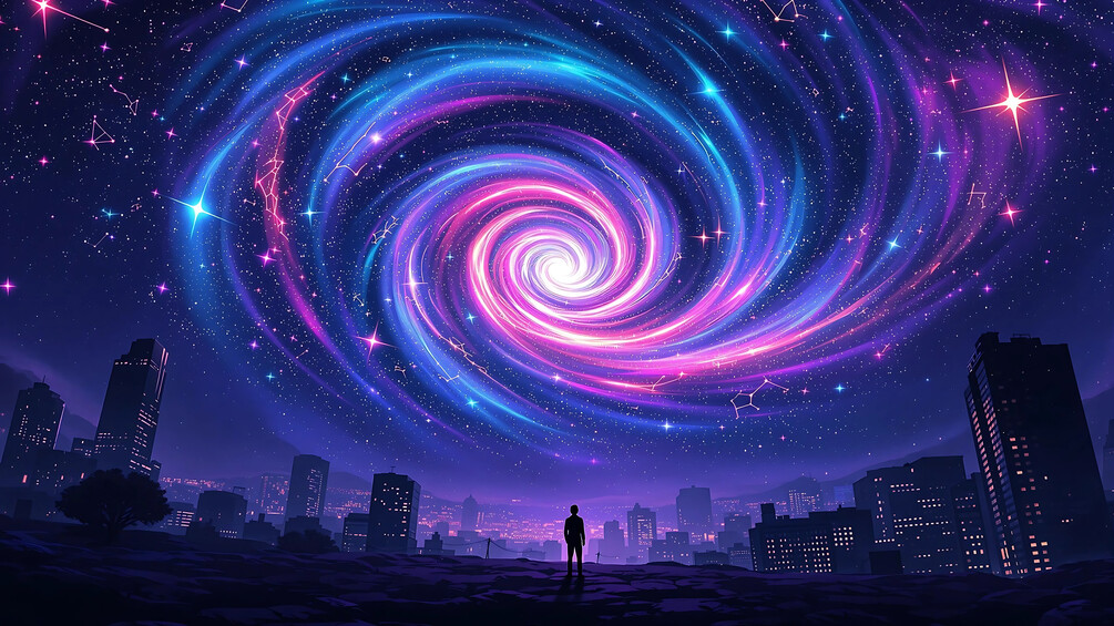 The bustling metropolis is transformed into a canvas of cosmic wonder, as swirling energies and celestial lights dance across the towering skyline. Framed by the solitary figure, this vision of the extraordinary juxtaposed with the ordinary invites the viewer to ponder the mysteries that lie beyond the everyday.