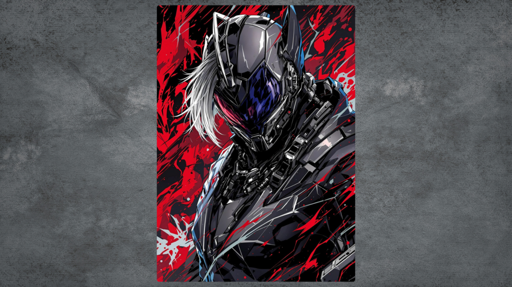 A striking illustration of an armored warrior with a metallic mask and flowing white hair against a blood-red splattered background. The intricate details of the futuristic armor, combined with the dramatic red and gray color scheme, create a powerful image of a cyber-enhanced fighter. This digital download merges elements of sci-fi, cyberpunk, and action aesthetics.
